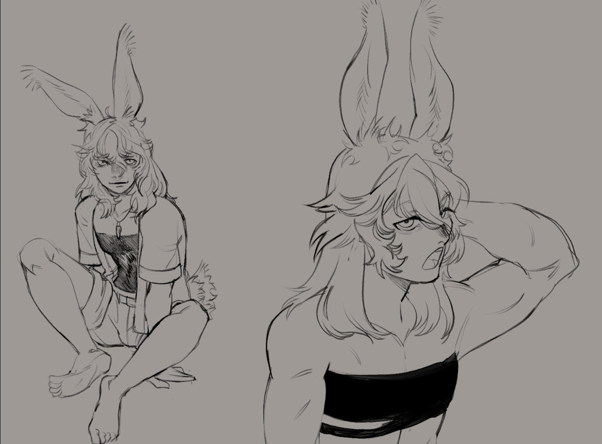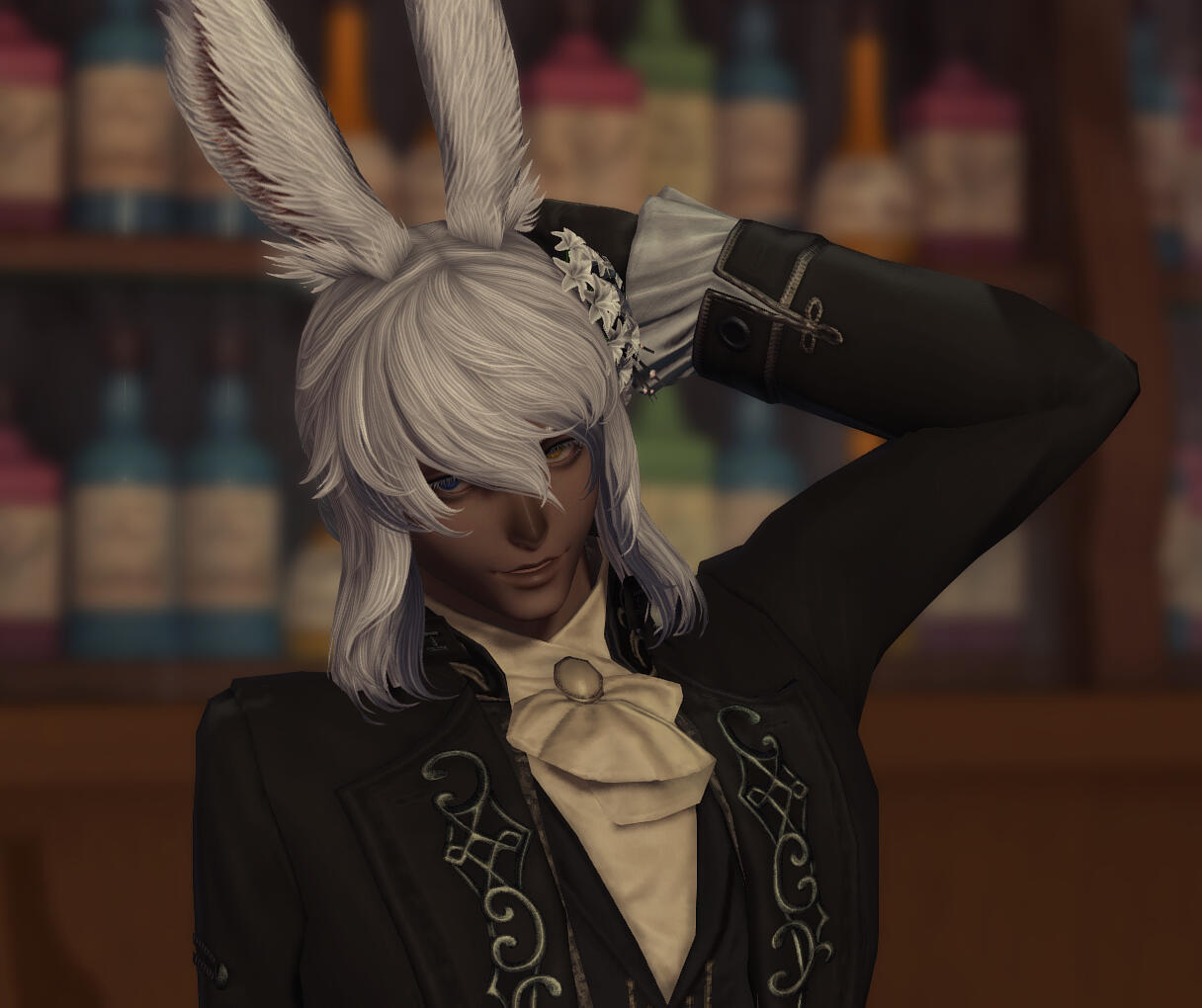 ascertain the requirements for the job. He is there greeted by another Viera who goes by the name of Robin Gelson. They talk, exchanging stories and experiences and soon after he applies to a position. He gets hired and begins working there as a server, opening up even more, allowing himself to be vulnerable and even falling in love with one of the customers who he fancied.On the side (before becoming official with Sirfe) , he ends up sleeping with Noctaire Lothurne, the venue owner of BBHC (Bunny Burrow Host Club). They get to know each other and even get close enough to the point Noctaire likes him so much that he gets special ... treatment. Levin applies for work at the host club as well, thinking it could be fun and gets accepted immediately, being the favorite of the boss.Also, his aether is rather messed up because of the voidsent that was attached to him for years on end, thus he scars a lot and when he tries to pic up Scholar to better himself, his carbuncle ends up looking... special. (think a borzoi)He also has two gun shot wounds, one in his shoulder and one in his lung that left him with less stamina for work and fun. He had to be hospitalized and have chirurgeons working on him. His recovery took a while and added some more scarring.